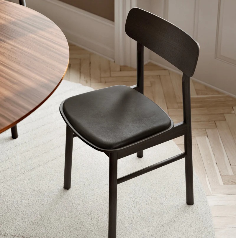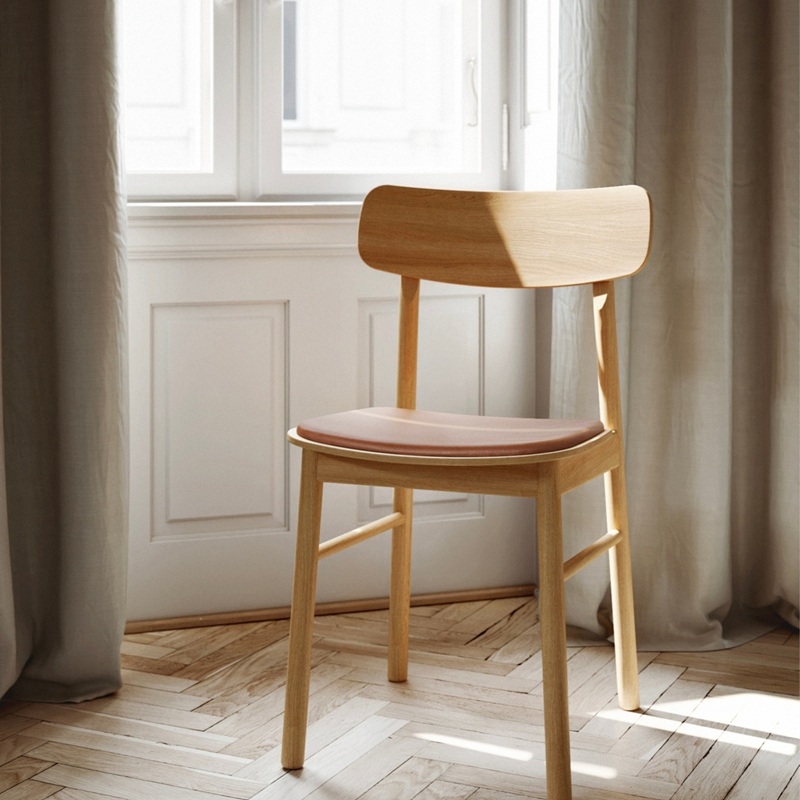 De stoel is ontworpen met waardering voor het materiaal en de eenvoud. De minimalistische lijnen van de zitting en rugleuning benadrukken de zachte vormen en elegante verbindingen van de poten. De stoel is van massief eikenhout met zitting en rugleuning van geolied eikenfineer en leer.