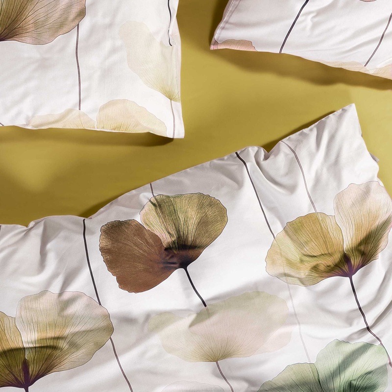 Waaiervormige bloembladeren op een dunne steel in verschillende tinten groen. Zo elegant als de bladeren van de Japanse notenboom Ginkgo. Verfijnd dessin gemaakt van 100% katoen satijn: een natuurlijk materiaal dat heerlijk zacht aanvoelt, een lichte glans heeft en oepel over je heen valt. Dankzij de hoge kwaliteit van de stof blijft het overtrek lang mooi en is het prettig in gebruik, elk seizoen opnieuw. De achterzijde is effen wit, wat zorgt voor rust en balans. De kussenslopen zijn voorzien van een bloemendetail uit het dessin, voor een subtiel en stijlvol geheel.