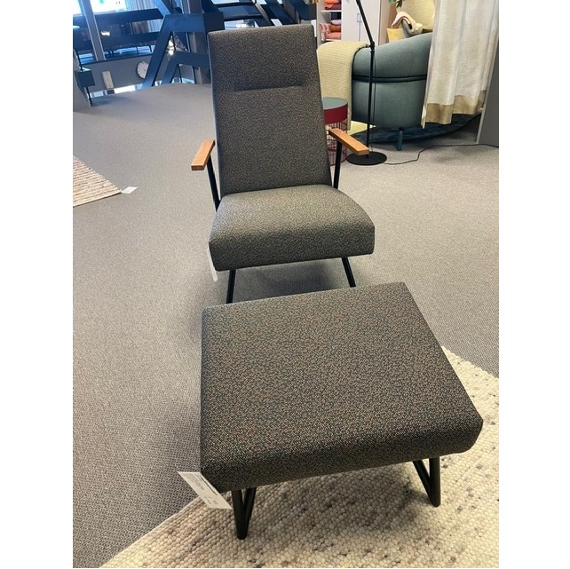 Fauteuil Mr Shell & hocker is gestoffeerd met stof Mica in de kleur Arion.Het frame is van zwart epoxy RAL 9005.