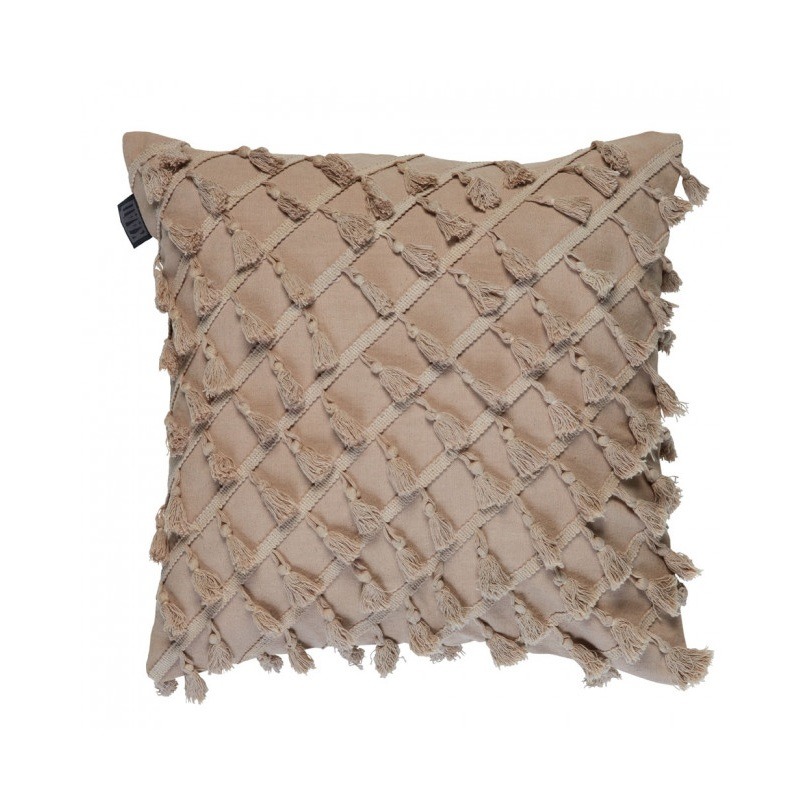 Grappig kussen in natureltint met passement kwastjes. Het kussen is gemaakt van 100% katoen en heeft aan de onderkant een ritssluiting. Het kussen wordt geleverd inclusief een stevig polyester binnenkussen.