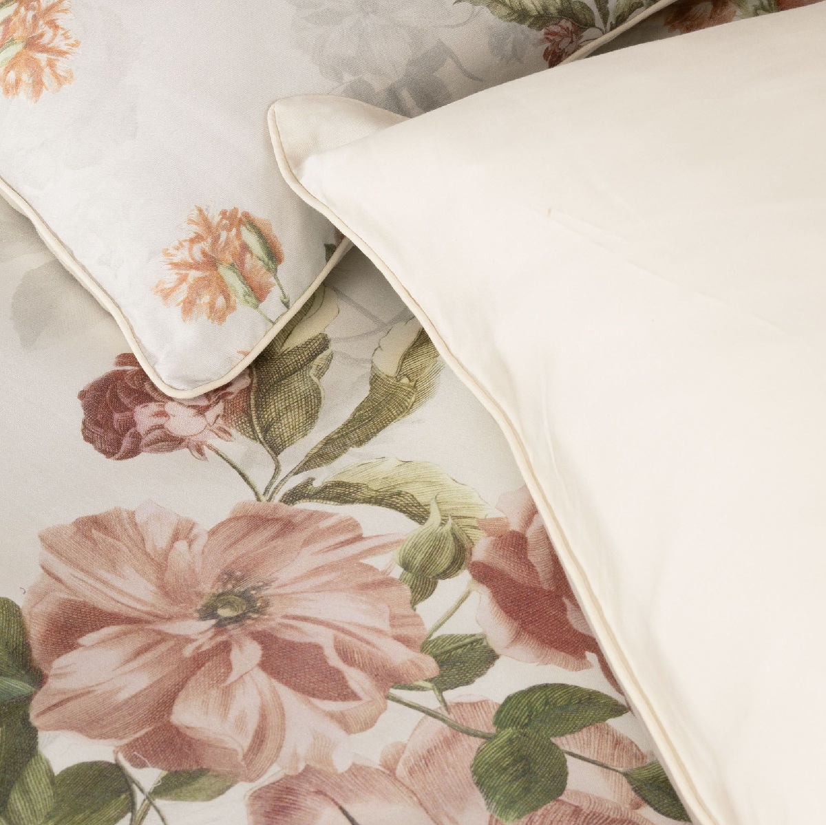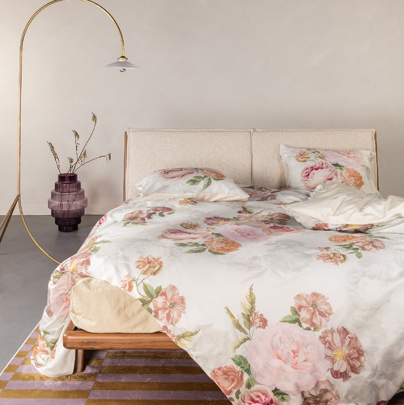 Het Orianna dekbedovertrek is een ode aan romantiek en tijdloze schoonheid. De print toont sierlijke boeketten, samengesteld uit rozen en een enkele anjer uit het rijke archief van het Rijksmuseum. De bloemen zijn harmonieus verspreid over het dessin en worden subtiel ondersteund door een schaduwprint op de achtergrond, die een extra dimensie en een dromerige uitstraling geeft. Gemaakt van 100% biologisch katoen satijn (GOTS-gecertificeerd), voelt Orianna heerlijk zacht, glad en soepel aan. De piping rondom het dekbedovertrek maakt het geheel stijlvol af.