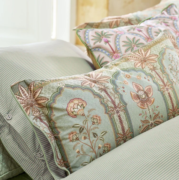 Het Bollywood Dreams dessin bestaat uit verschillende bloemenmotieven en decoratieve boogjes, geïnspireerd op de Indiase paleisbogen. De bloemenmotieven en sierlijke boompjes lopen subtiel in elkaar over. Het overtrek en de kussens zijn luxe afgewerkt met een ronde bies. Dit geeft een speels mix&match-effect op je bed. Het beddengoed van Pip Studio is gemaakt van fijngeweven katoenperkal van 200TC. Dankzij de hoge draaddichtheid voelt deze stof stevig en ‘crispy’ aan en is het zachter en fijner dan normaal katoen.