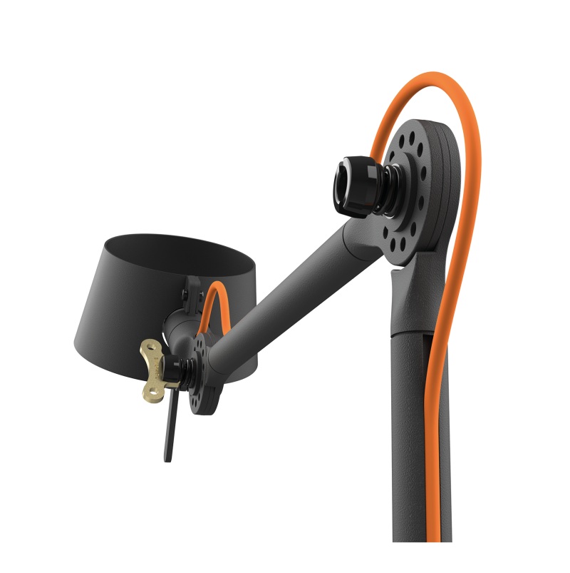 Designdetail: De kleur van het snoer tussen de kap en de voet kun je zelf kiezen: ga voor een opvallend oranje accent of kies voor een subtiele zwarte variant. Zo bepaal je zelf welke look het beste bij jouw stijl past. Het snoer van de fitting naar de lamp is altijd zwart, ongeacht de uitvoering.