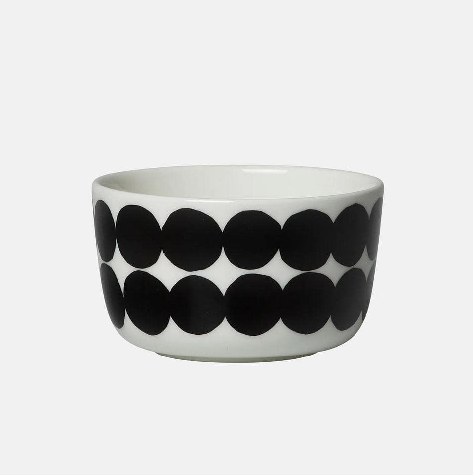 Deze kleine kom is gedecoreerd met wit en zwarte cirkels.