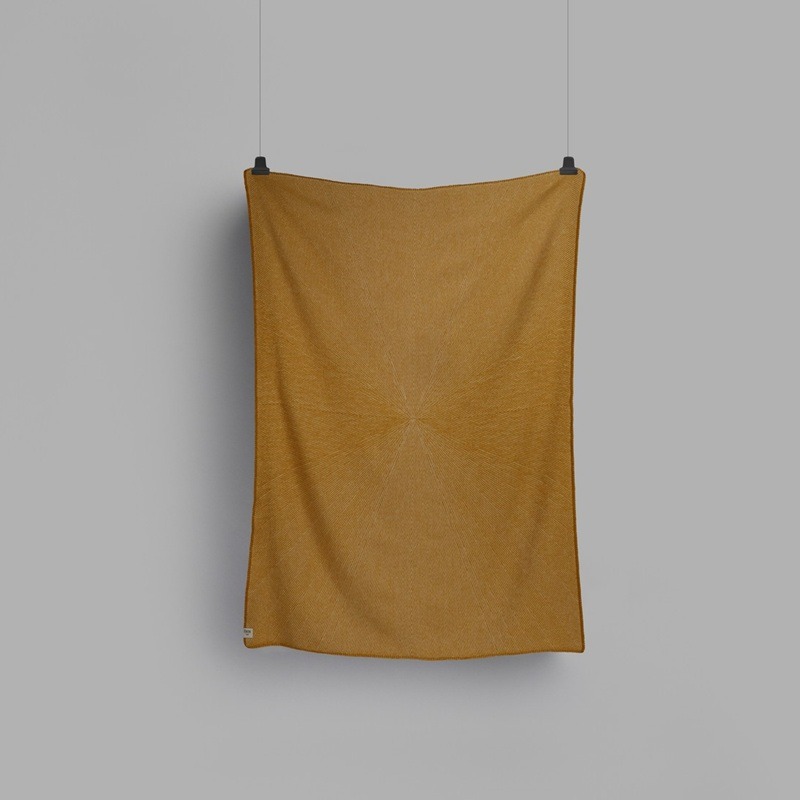 De Holiday Triptych-serie is een collectie plaids van lamswol waarbij elk ontwerp deel uitmaakt van een groter geheel. De lijnen in “Sun Throw” verspreiden zich vanuit het midden, als zonlicht dat vanuit het midden van de zon schijnt.