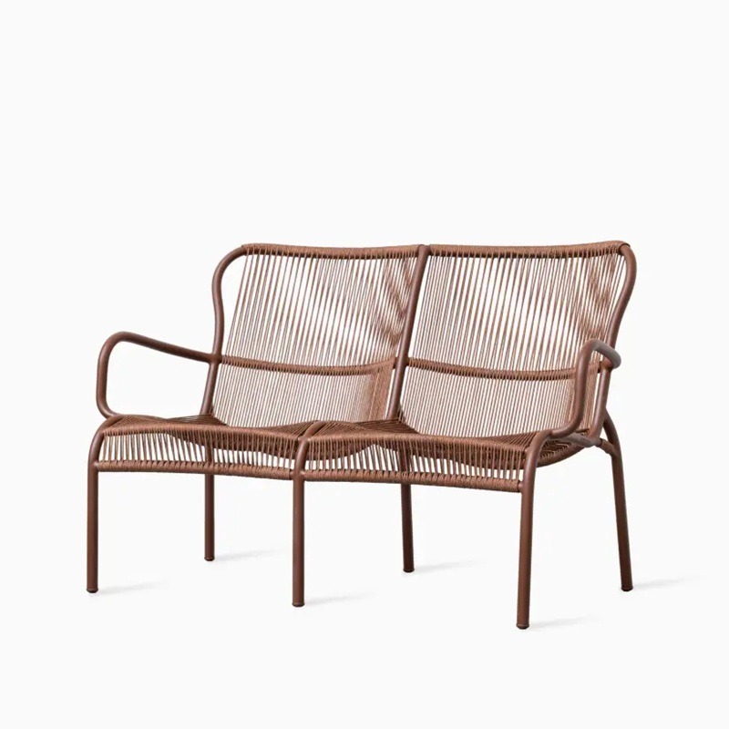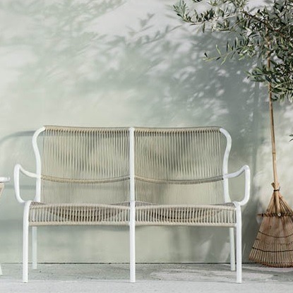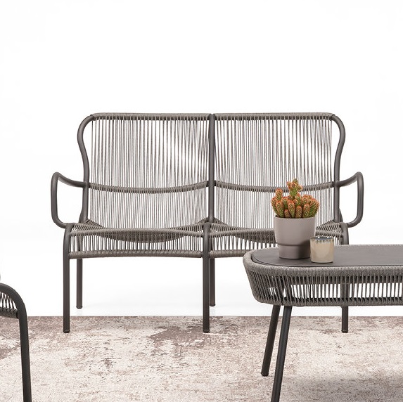 De Loop sofa is een lichte, verfijnde outdoor sofa met een tastbare elegantie. Het gepoederlakte aluminium frame biedt strakke stabiliteit, terwijl het met de hand gevlochten touw zorgt voor een luchtige uitstraling. Zo licht als een veertje, maar een stevige zit. Makkelijk te verplaatsen en door de transparente look staat de sofa nooit in de weg. Vooral bij de zwarte uitvoering blijft het accent op de planten in de tuin, en is de bank je rustplek in je eigen groene oase. Bij de zwarte versie is de zitting van polyethyleenvezel. De andere kleuren hebben een zitting van touw uir polyprolyleen, zeer sterk dus. Het touw is ton-sur-ton gekleurd aan het frame.