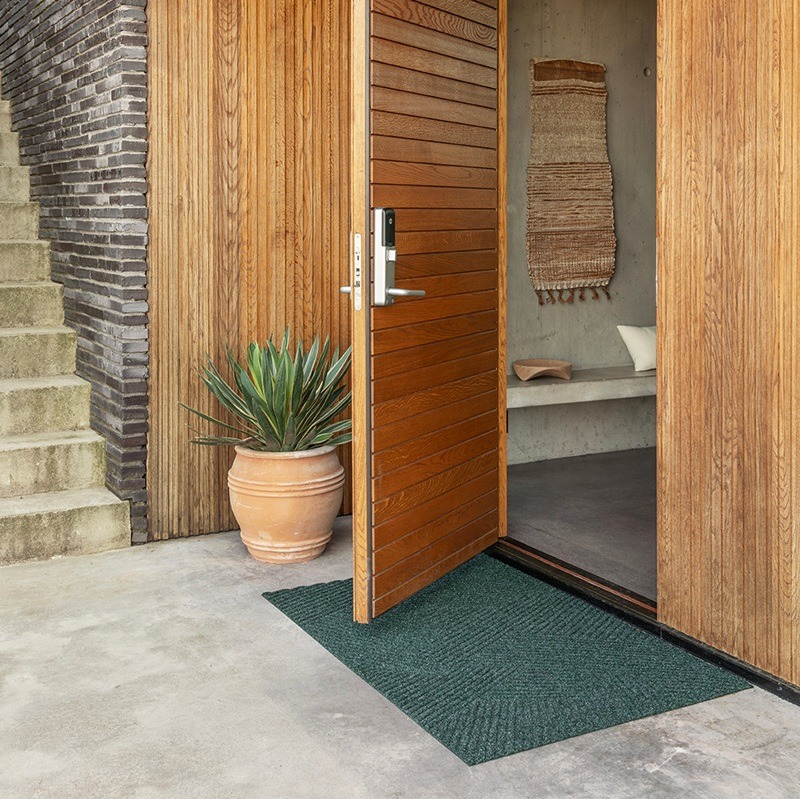 Deurmat Strå stelt wuivend gras in een warme zomerbries voor, prachtig geïllustreerd door en zacht, geometrisch ontwerp in een diepe kleur groen. Het drie-dimensioneel patroon creëert een rustige sfeer bij de deuringang. Deze deurmat uit de collectie van Heymat is een wat ruigere mat in vergelijking met de andere matten. Je ziet deze mat ook vaak gecombineerd met een binnenmat van Heymat. Deze mat kan namelijk wel buiten liggen en zal vocht afvoeren en de schoenen goed schoon schrapen. Maar let op, het is evengoed belangrijk om de voeten te vegen, het helpt niet als je er overheen 'vliegt'.