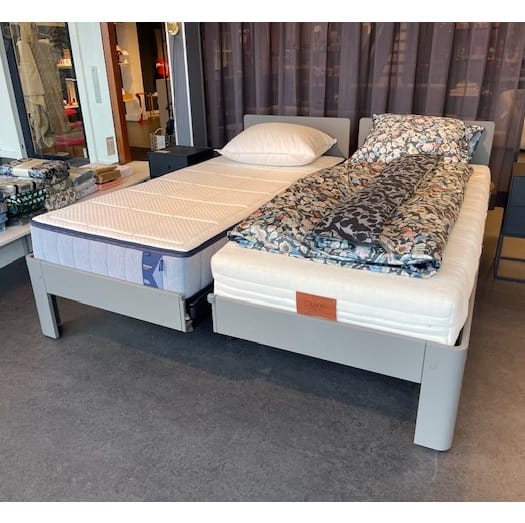 Op deze pagina vind je ons showroommodel Auronde 1500 in de deelbare uitvoering. De kleur van het bed is lak warm grey, de spiraalbodems zijn vlak. Omdat het een deelbare bed betreft vind je er ook twee kleinere hoofdborden op. Bij een deelbaar bed kun je de voeteneinde los van elkaar opzij schuiven.