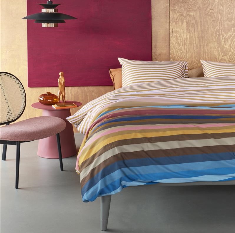 Dekbedovertrek Girona van Beddinghouse Dutch Design zorgt voor een levendige start van de dag. De subtiele combinatie van strepen in zachte tinten op een witte ondergrond maken het een fris dessin. Het overtrek krijgt een mooie glans en voelt zacht aan door het gebruik van 100% katoensatijn. De achterzijde van het overtrek is oker met wit gestreept, hierdoor kan je het dekbedovertrek dubbelzijdig gebruiken. Dit product voldoet aan de strenge normen van het GOTS keurmerk (Global Organic Textile Standard). Dit betekent biologische textielproductie op een milieuvriendelijke en sociaal verantwoorde wijze. Het overtrek heeft een dubbele instopstrook en een totale lengte van 260 cm. Door deze extra lengte kan het dekbedovertrek gemakkelijk onder het matras worden gestopt en is het geschikt voor hoge matrassen. Het dekbedovertrek is passend voor dekbedden van 200 cm, 210 cm of 220 cm.