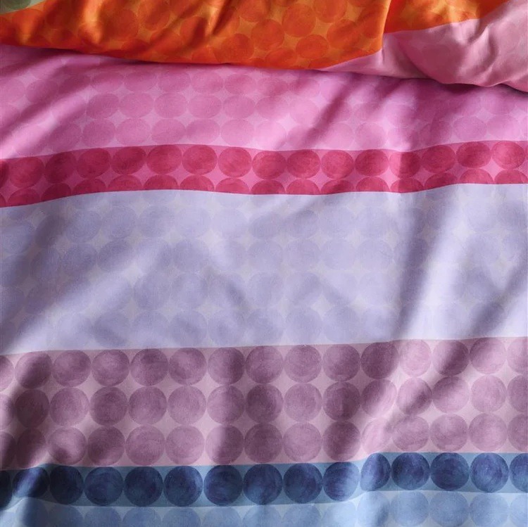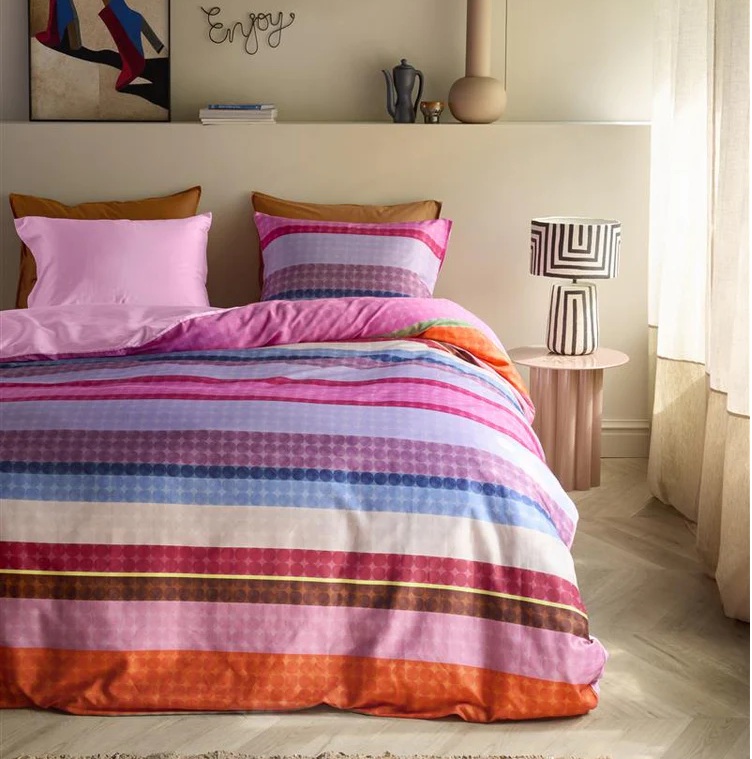 De grote, stevige strepen op dit dessin worden aangevuld met een vrolijk detail – talloze stippen die het geheel een speelse textuur geven. In combinatie met contrastrijke kleuren maak je met het Maddison dekbedovertrek van Oilily een stijlvol statement in je slaapkamer. De achterzijde van het overtrek heeft een effen roze kleur. Over Oilily Bedtextiel van Oilily staat bekend om unieke kleurcombinaties, vrolijke ontwerpen, rijke en unieke prints en oog voor detail. Duurzame verpakking De verpakking is niet alleen mooi maar ook nog eens duurzaam. Om het dekbedovertrek heen zit een banderol gemaakt van FSC-karton. De banderol heeft in het midden een uitsnede, zodat je het dessin goed kunt zien. Gooi de banderol weg met het karton voor recycling. Hoogwaardige kwaliteit Het dekbedovertrek is gemaakt van 100% katoensatijn, 200 TC. Katoensatijn is gemaakt van hoge kwaliteit katoen, heeft een delicate glans en voelt zacht aan door de satijnweving. Het overtrek heeft over de gehele breedte aan beide zijden een dubbele instopstrook. De totale lengte van een Oilily dekbedovertrek is 260 cm. Dit is extra lang waardoor het dekbedovertrek gemakkelijk onder het matras gestopt kan worden en koude voeten worden voorkomen. Het overtrek is geschikt voor bedden van 200 cm, 210 cm of 220 cm. Better Cotton Dit product is geproduceerd door Bedding House, exclusief voor Oilily.