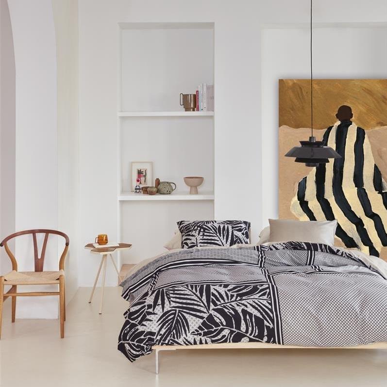 Dekbedovertrek Satelite Black van Dutch Design zorgt, door de bladeren en de divers gevulde vakken, voor een grafisch botanische mix. Het overtrek is perfect voor de moderne slaapkamer. Als je soms een keer voor een rustigere kant wilt gaan, dan kan dat ook. De achterkant heeft een effen beige kleur. Zo is het overtrek dubbelzijdig te gebruiken.Het overtrek is gemaakt van 100% katoensatijn, dit geeft niet alleen een prachtige glans maar het voelt ook heerlijk zacht aan. Het overtrek heeft een dubbele instopstrook en een totale lengte van 260 cm. Door deze extra lengte kan het dekbedovertrek gemakkelijk onder het matras worden gestopt en is het geschikt voor hoge matrassen. Het dekbedovertrek is passend voor dekbedden van 200 cm, 210 cm of 220 cm.