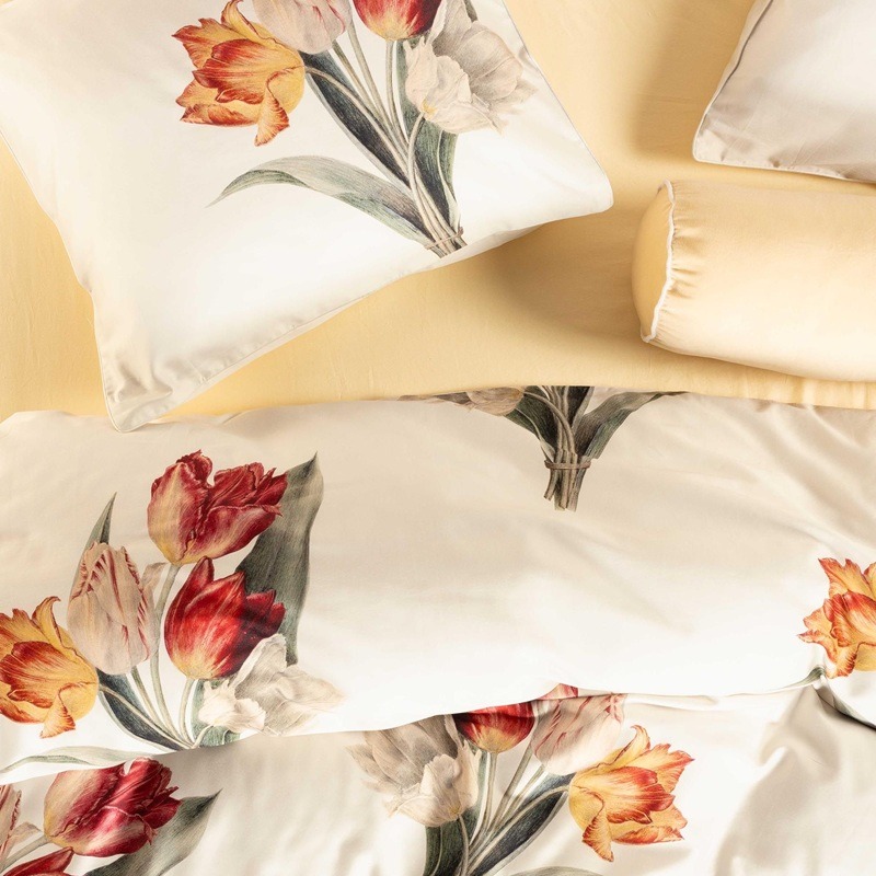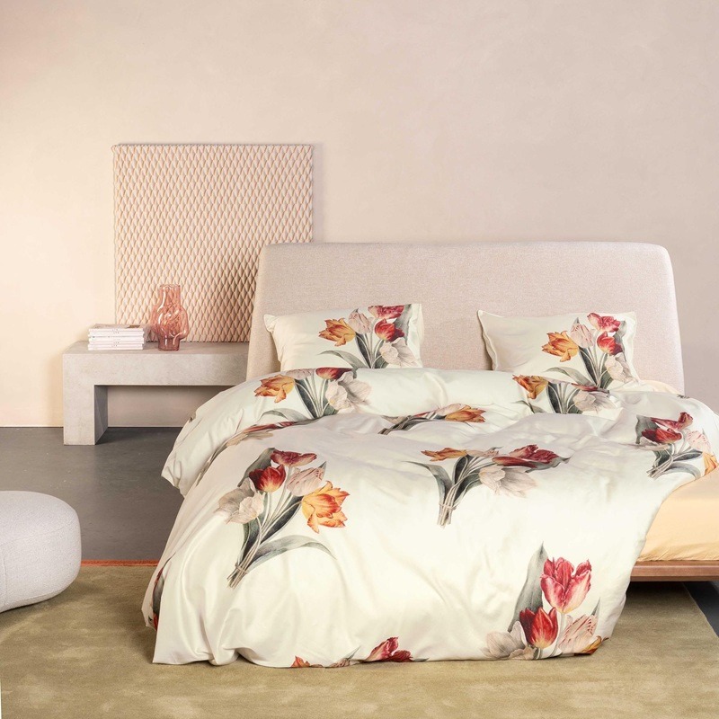 Het Essenza dekbedovertrek Tosca in de kleur Vanilla is een elegant en romantisch dessin waarin klassieke tulpboeketten centraal staan. De rijk gedetailleerde bloemen hebben een uitstraling die doet denken aan botanische illustraties: zacht, verfijnd en vol karakter. De herhaling van de boeketten zorgt voor een rustig, harmonieus geheel dat warmte en sfeer toevoegt aan de slaapkamer. De achterzijde van het overtrek is uitgevoerd in een effen, rustige tint die het bloemenpatroon mooi in balans brengt. Met de extra lange instopstrook over de volle breedte maak je je bed eenvoudig en netjes op. Het overtrek wordt geleverd met bijpassende kussensloop.