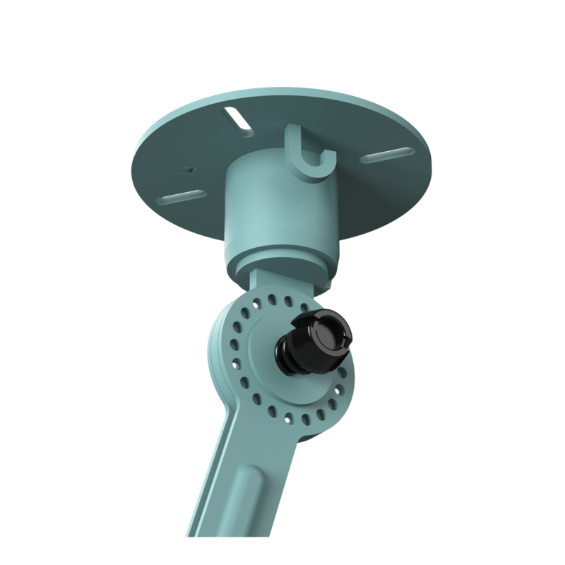 De plafondlamp bestaat uit 2 verstelbare gepoedercoate stalen armen en een open kap van gepoedercoat aluminium. Deze is ook verstelbaar.
